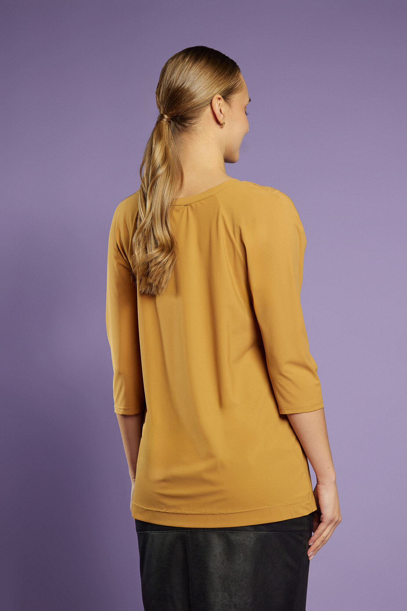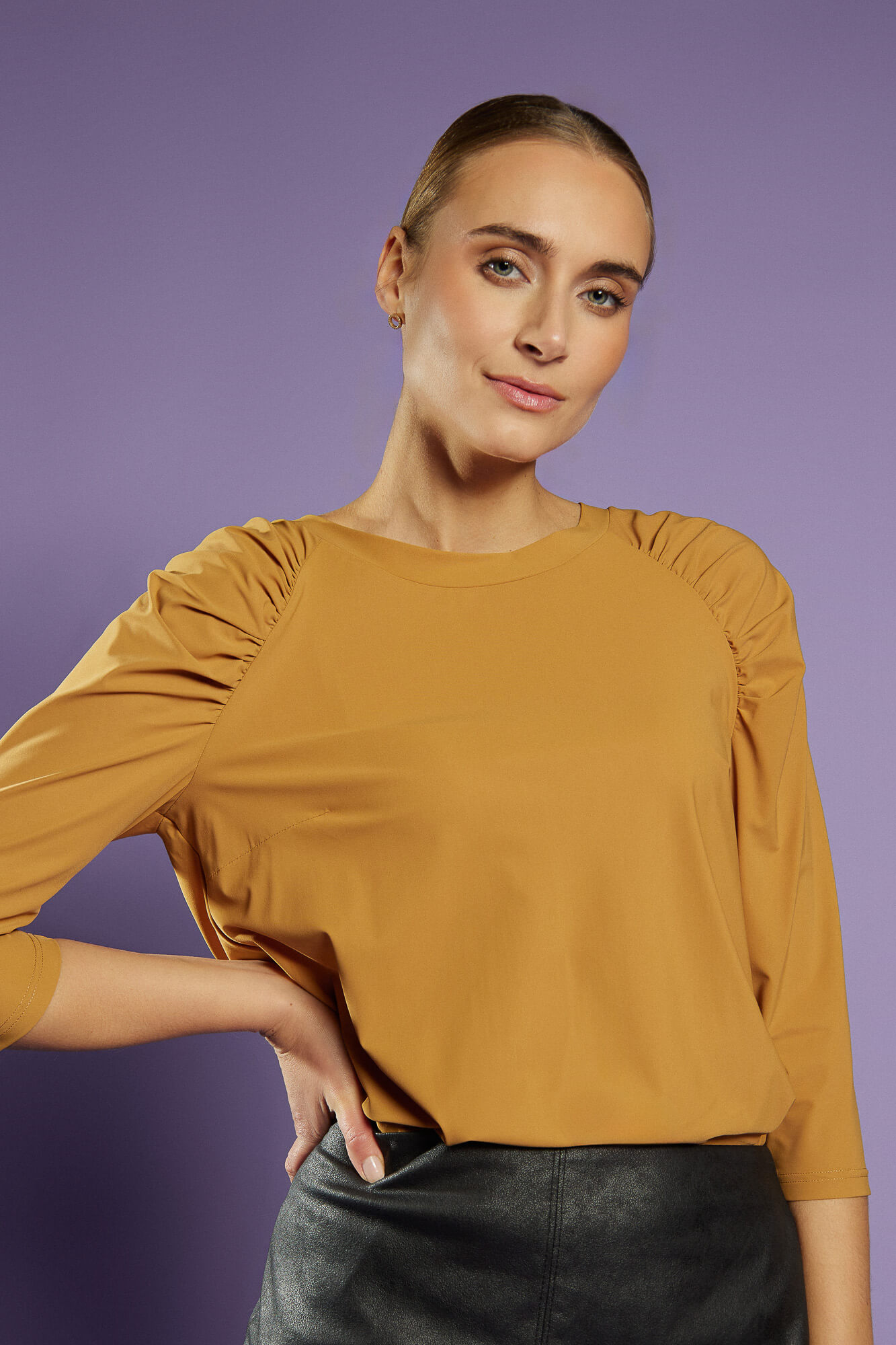 Bluzka z marszczonym rękawem o długości ¾ – musztardowa