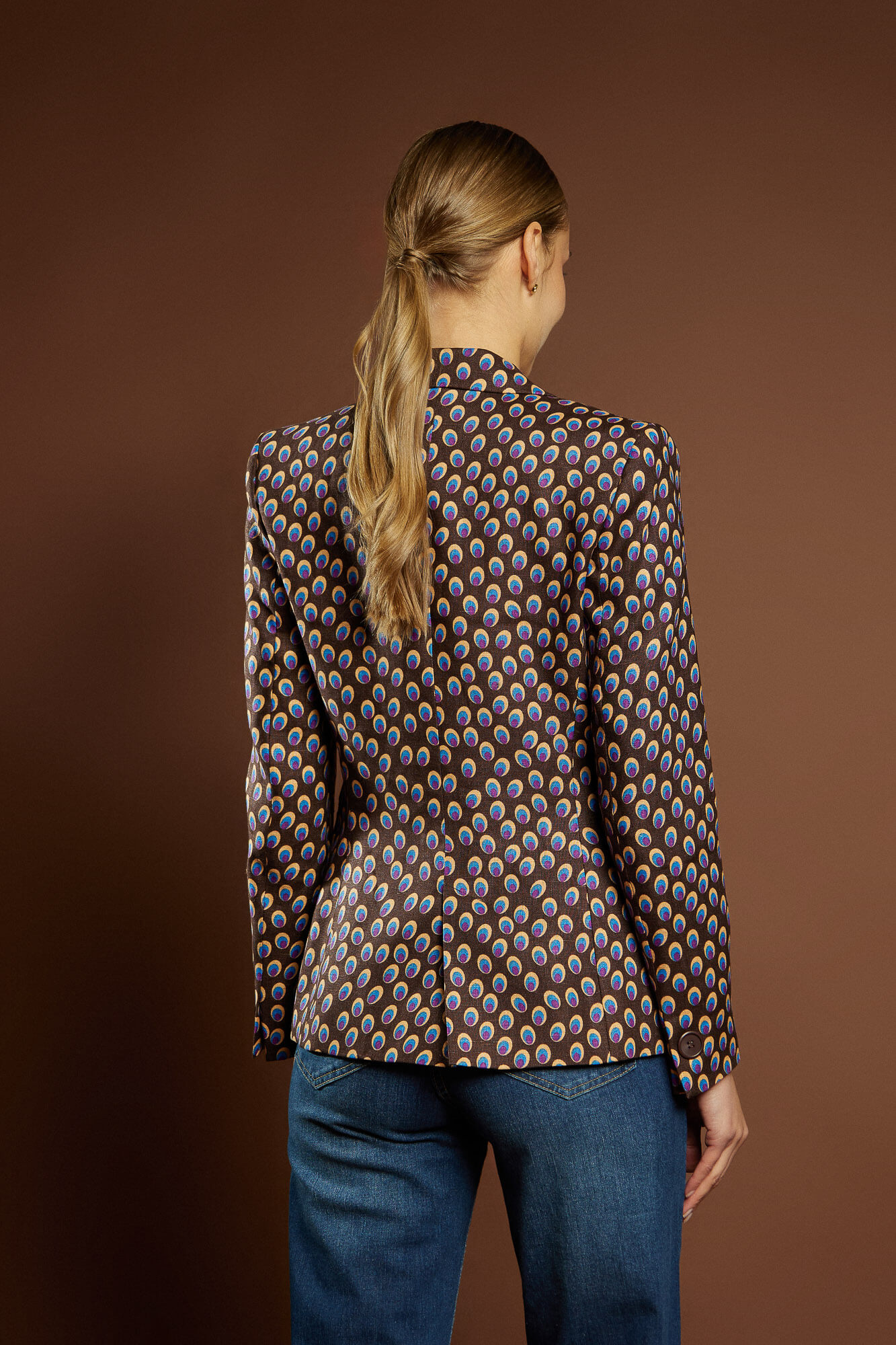 Klasyczny brązowy żakiet z nadrukiem a’la pawie oczka to element garderoby, który z pewnością przyciągnie uwagę. Wykonany z lnu, jest lekki i przewiewny, co sprawia, że idealnie sprawdzi się w cieplejsze dni. Jego unikalny wzór dodaje charakteru i sprawia, że żakiet wyróżnia się spośród innych klasycznych modeli. Można go nosić zarówno na co dzień, jak i na specjalne okazje, zestawiając go z eleganckimi spodniami lub spódnicą. Doskonale będzie również wyglądał w połączeniu ze spodniami typu jeans.
