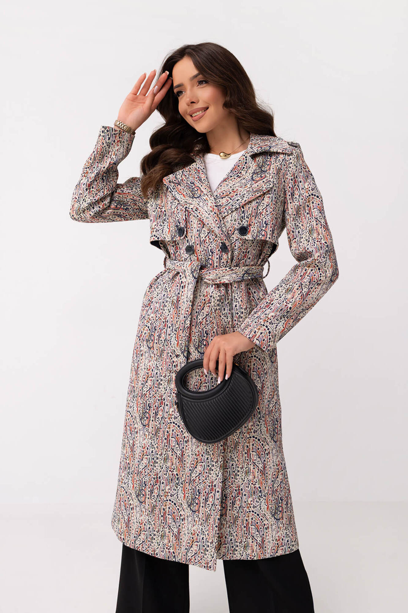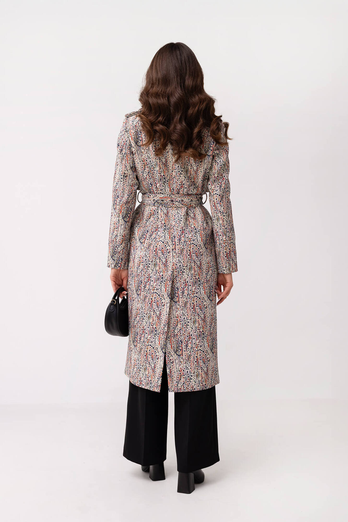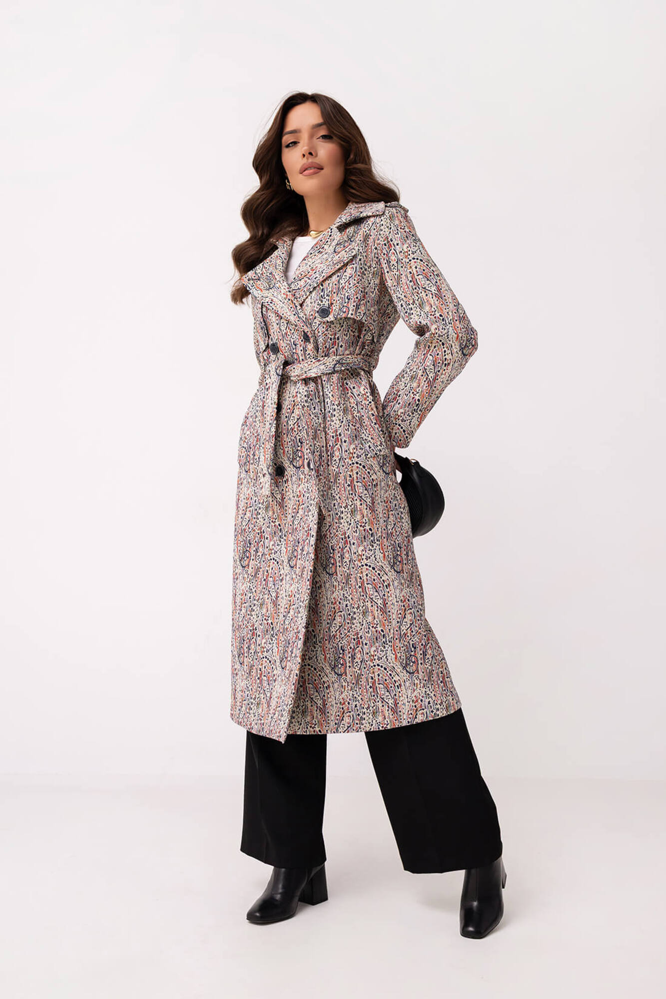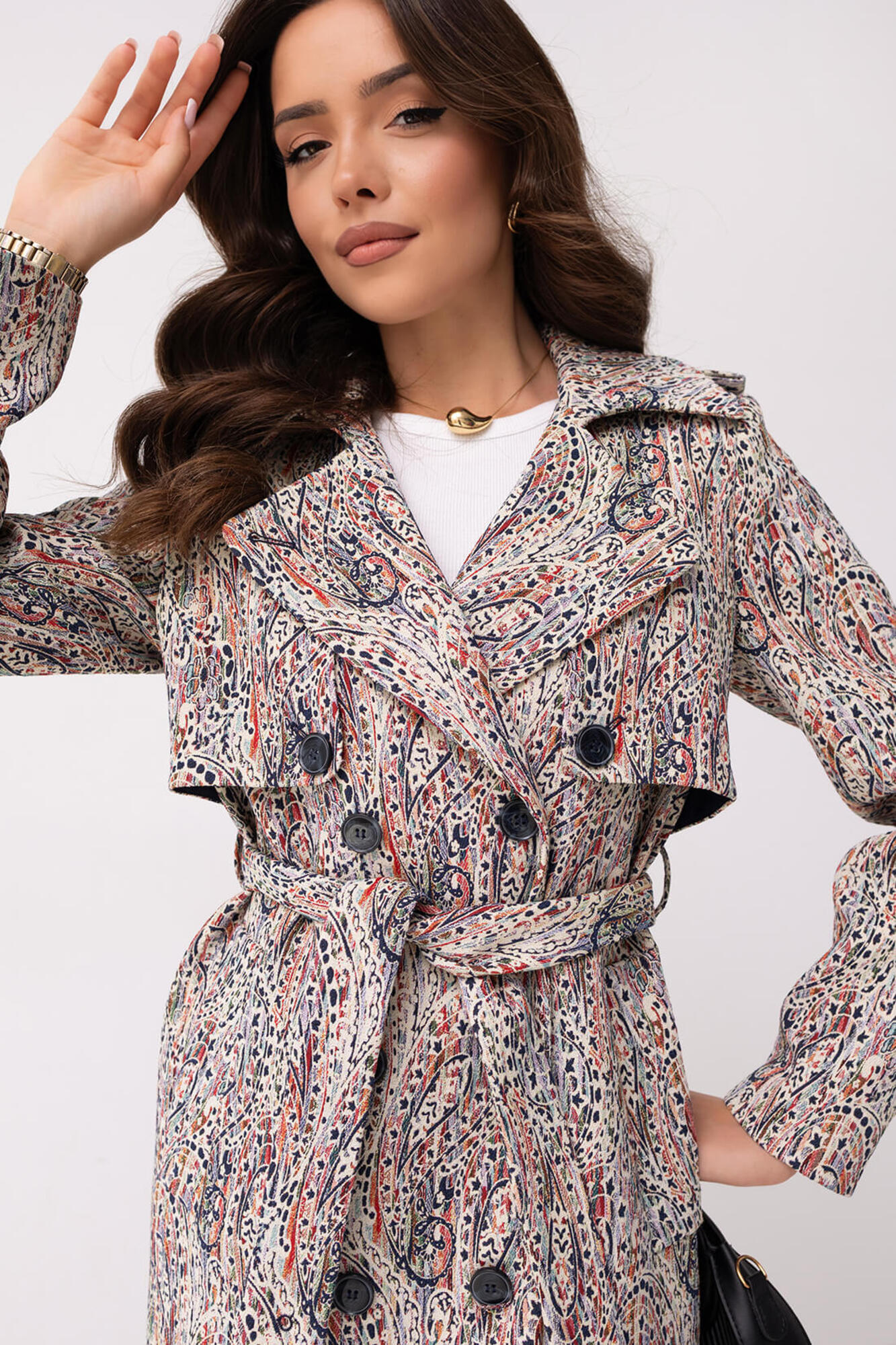 Ten elegancki trencz to połączenie klasyki i nowoczesnego wzornictwa, które sprawia, że idealnie sprawdzi się zarówno w codziennych, jak i bardziej formalnych stylizacjach. Wykonany z lekkiego, przyjemnego w dotyku materiału o niezwykle oryginalnym, wielokolorowym wzorze paisley, przyciąga uwagę i nadaje stylowi unikalnego charakteru. Dwurzędowe zapięcie na guziki w połączeniu z paskiem w talii pięknie podkreśla sylwetkę, a szeroki kołnierz i ozdobne patki na ramionach dodają całości ponadczasowego szyku. Długość sięgająca kolan sprawia, że trencz jest wyjątkowo uniwersalny i świetnie prezentuje się zarówno z eleganckimi spodniami, jak i z sukienką czy klasycznymi jeansami. To okrycie wierzchnie nie tylko chroni przed chłodniejszymi dniami, ale przede wszystkim stanowi stylowy element garderoby, który wyróżni Cię w tłumie. Idealny na sezon jesienny, stanie się kluczowym elementem Twojej szafy, łącząc funkcjonalność z ponadczasowym designem.
