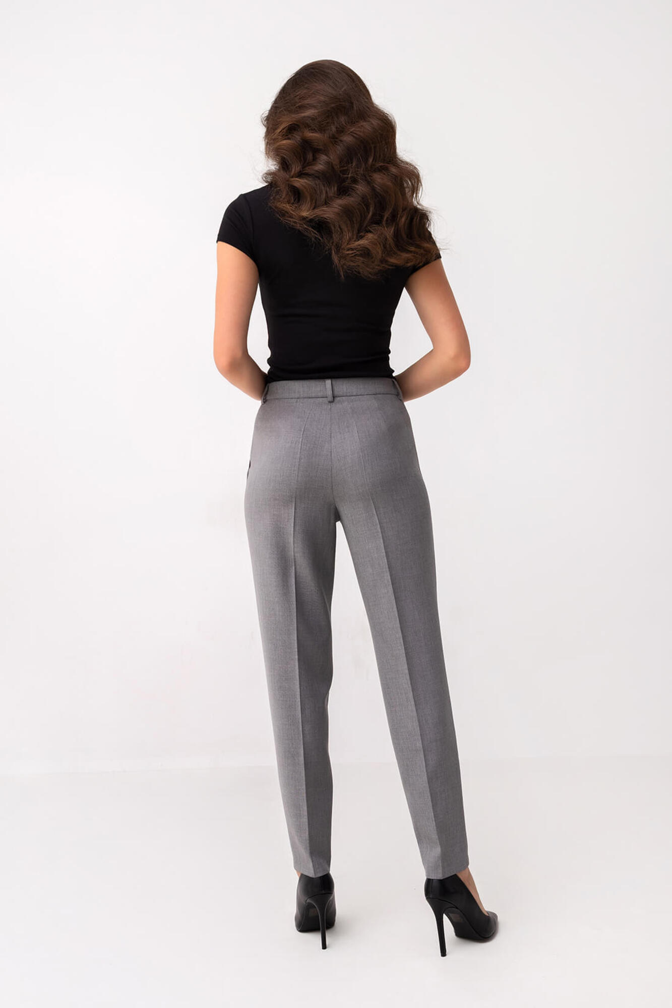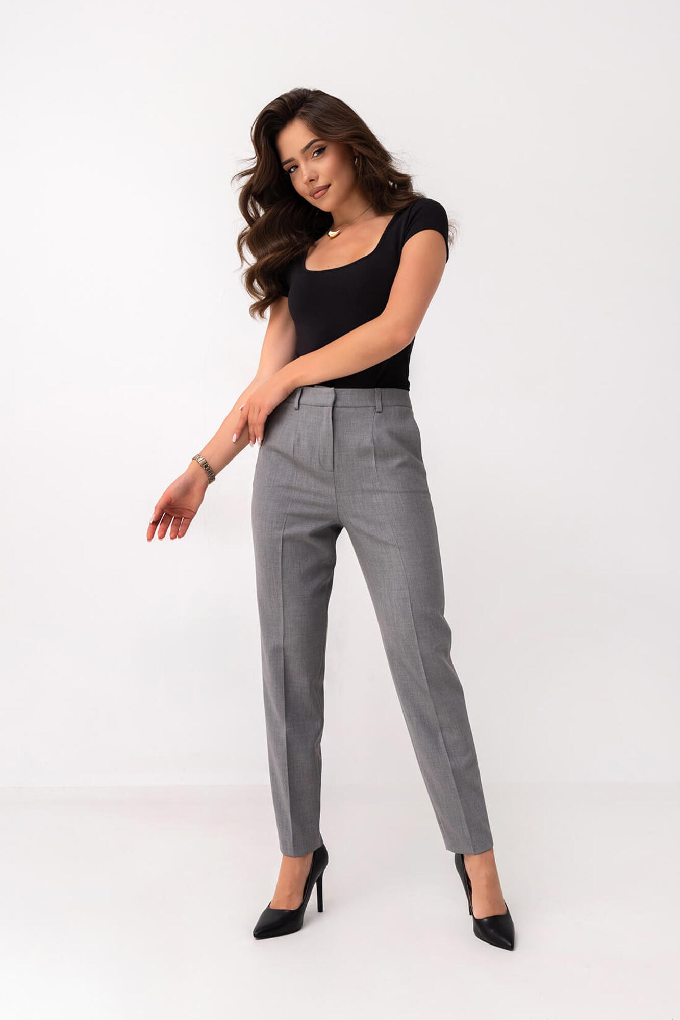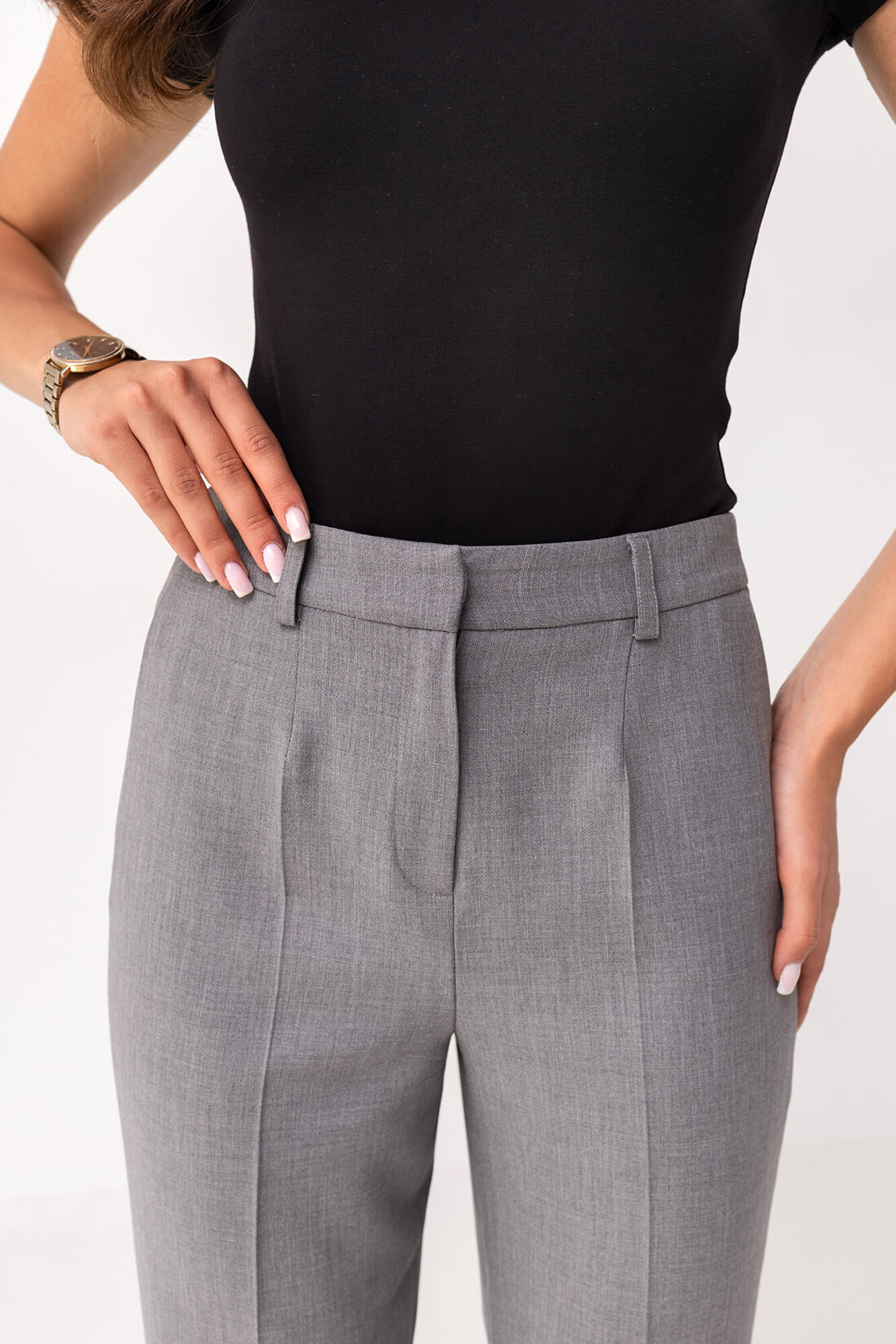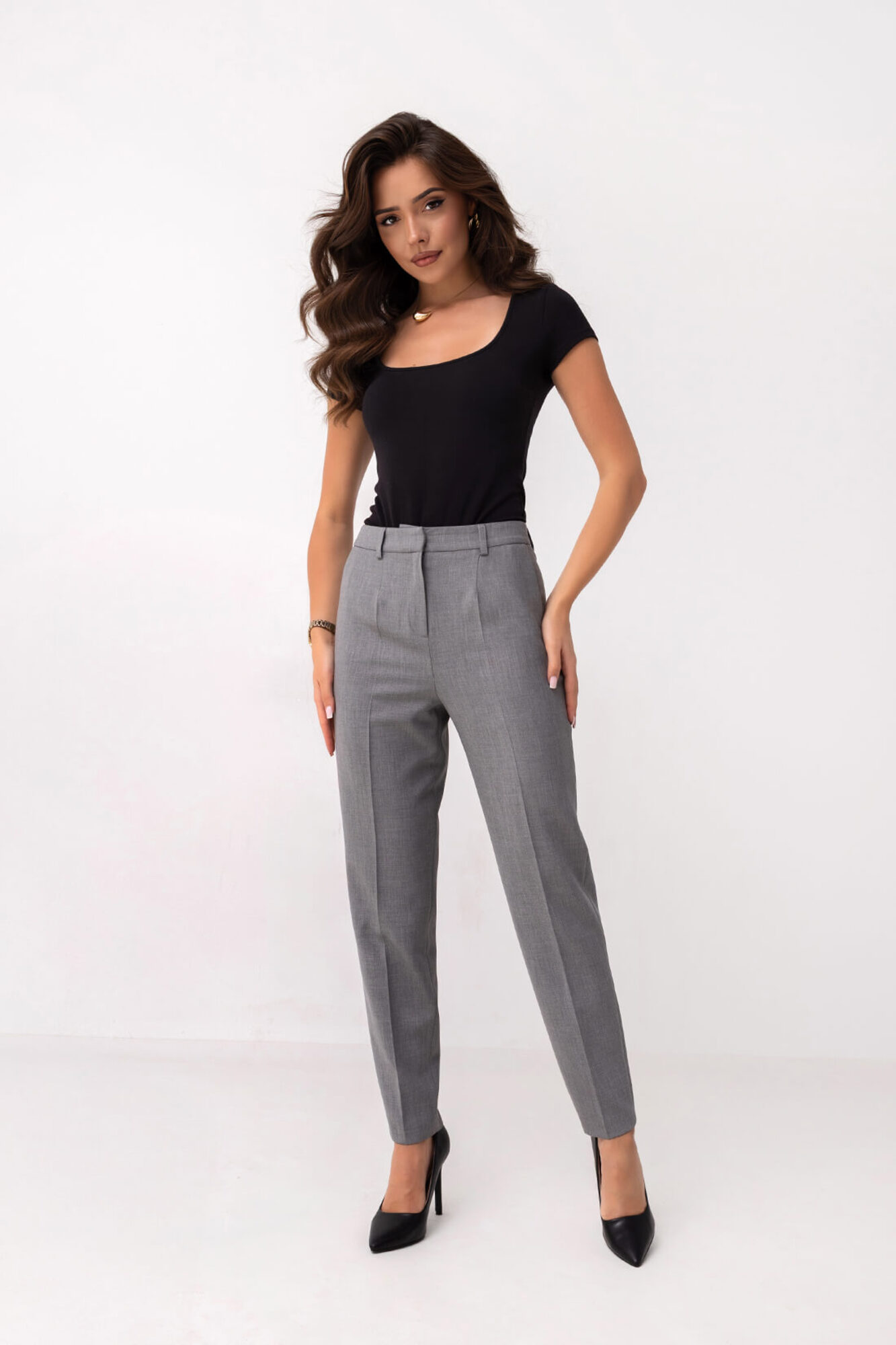 Szare spodnie damskie w kant o ponadczasowym kroju, zaprojektowane z myślą o elegancji i wygodzie. Uszyte z gładkiej, wysokogatunkowej tkaniny prezentują się wyjątkowo schludnie i stylowo. Posiadają kryte zapięcie na haftkę z dodatkowym guzikiem wewnętrznym oraz zamek, a także szlufki umożliwiające dobranie paska. Kieszenie po bokach dodają praktyczności, a nogawki delikatnie zwężane ku dołowi podkreślają smukłość sylwetki i nadają całości lekkości. Neutralny, jasnoszary kolor sprawia, że spodnie świetnie komponują się zarówno z klasycznymi koszulami, jak i bardziej nowoczesnymi elementami garderoby. Dostępna w zestawie marynarka z tej samej tkaniny pozwala stworzyć spójny, elegancki garnitur.
