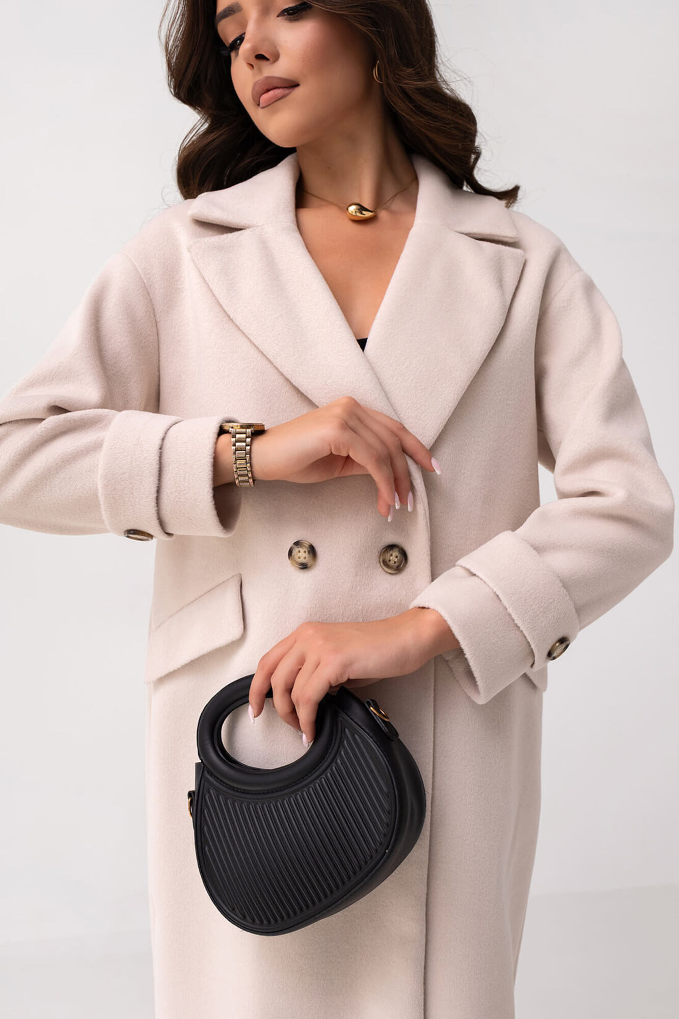 Dwurzędowy płaszcz przed kolano w kolorze kremowym. Wykonany z wysokiej jakości materiału. Materiał jest miękki, ale zarazem trwały. Konstrukcja została zaprojektowana tak, by zapewnić idealny balans między prostotą a wyrafinowanym stylem – szerokie klapy, ozdobne guziki z subtelnym połyskiem oraz kieszenie z patkami tworzą spójny, wyważony projekt. Krój utrzymany w delikatnie luźniejszej formie daje lekki efekt oversize, który w połączeniu z długością przed kolano wygląda nowocześnie i z klasą. Rękawy wykończone są guzikiem na mankiecie, co podkreśla dbałość o detale.