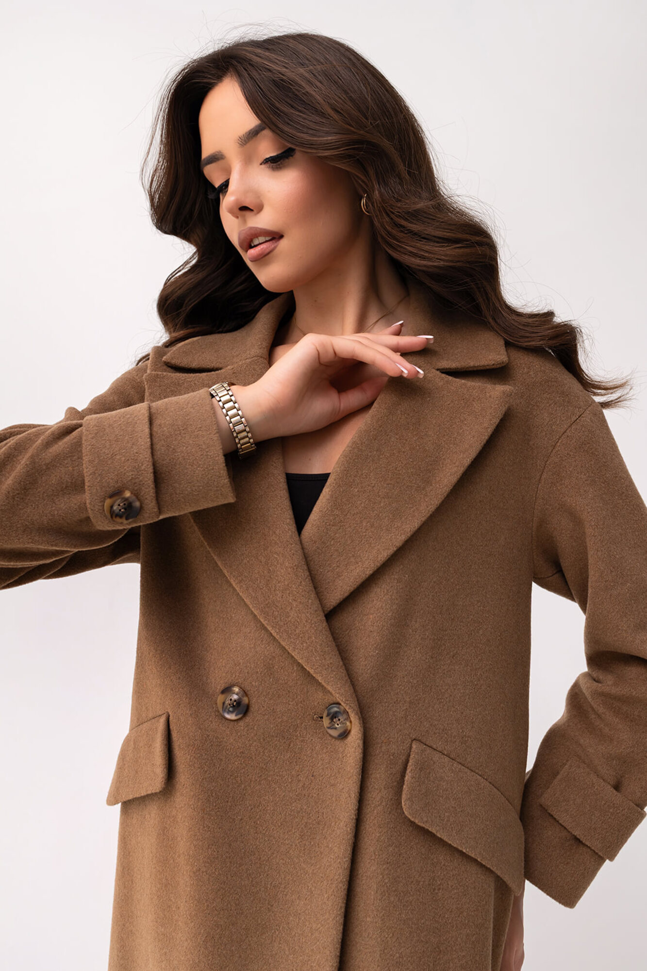 Jasno brązowy płaszcz o długości przed kolano, zaprojektowany z myślą o prostocie i elegancji. Wykonany z tkaniny z dodatkiem wełny, posiada przyjemną w dotyku fakturę i odpowiednią sztywność, dzięki czemu idealnie trzyma formę. Dwurzędowe zapięcie na ozdobne guziki oraz szerokie, geometryczne klapy podkreślają jego minimalistyczny charakter. Całość utrzymana jest w prostej, nieco luźniejszej linii, co zapewnia swobodę i wygodę podczas noszenia. Na wysokości bioder znajdują się klasyczne kieszenie z patkami, które dopełniają całość i dodają płaszczowi wyrazistości. To model, który wyróżnia się dopracowaną konstrukcją i dbałością o detale.