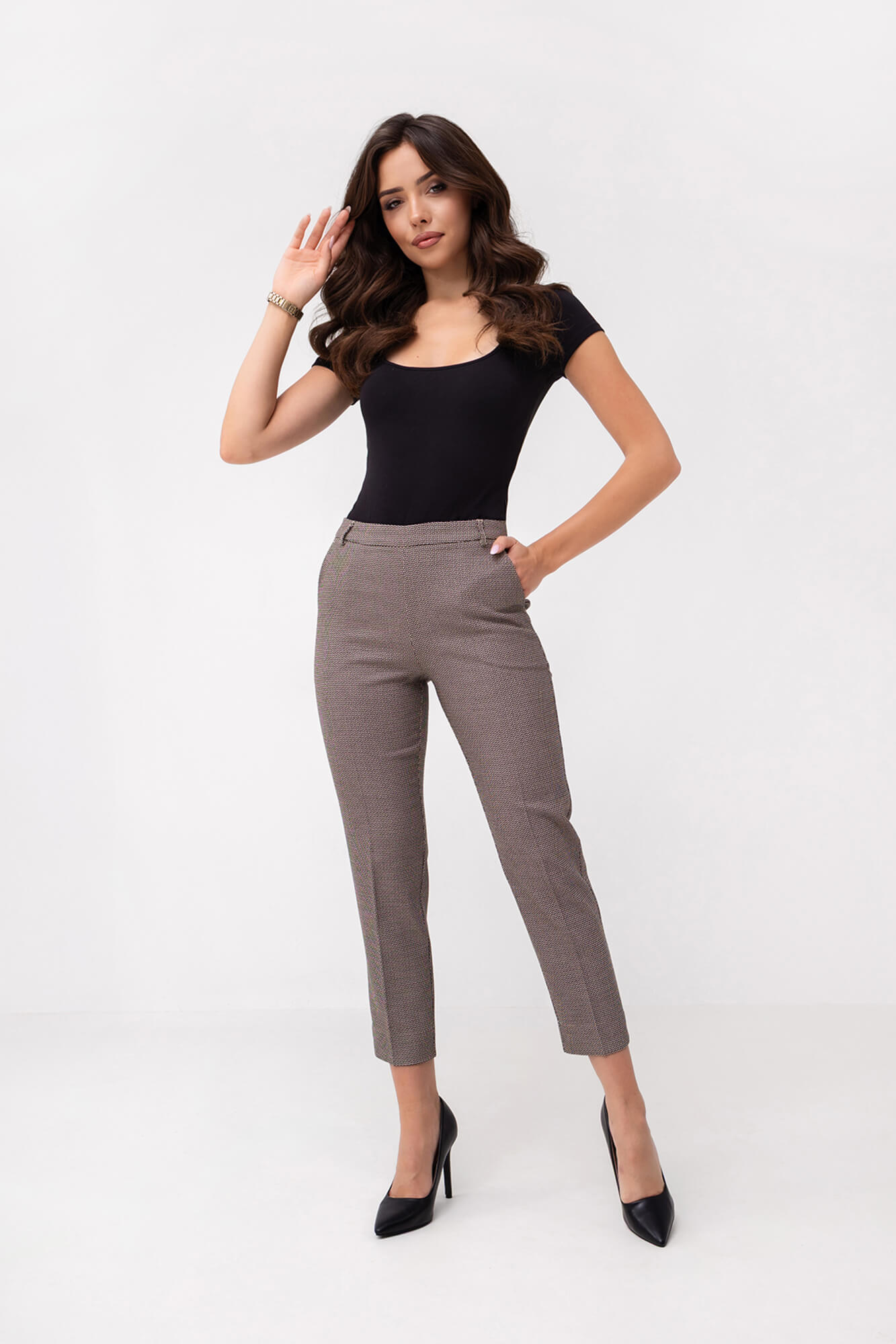 Eleganckie spodnie damskie to doskonała propozycja dla kobiet, które cenią sobie styl i wygodę w codziennych stylizacjach. Wykonane z wysokiej jakości materiału, pięknie układają się na sylwetce i podkreślają jej atuty. Mają klasyczny, zwężany ku dołowi krój o długości sięgającej nad kostkę. Z przodu wyposażone są w praktyczne kieszenie, natomiast z tyłu zapinane są na kryty zamek, co gwarantuje wygodę noszenia i estetyczny wygląd. Subtelny wzór materiału dodaje im elegancji i sprawia, że świetnie komponują się zarówno w zestawieniach biznesowych, jak i w bardziej casualowych stylizacjach. Spodnie można połączyć z dostępnym w ofercie żakietem, tworząc idealny komplet, który sprawdzi się zarówno do pracy, jak i na wyjątkowe okazje.