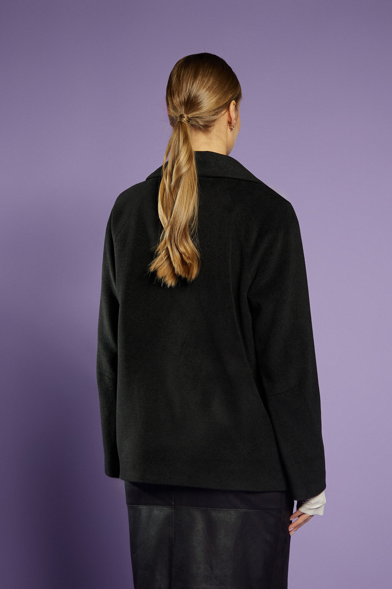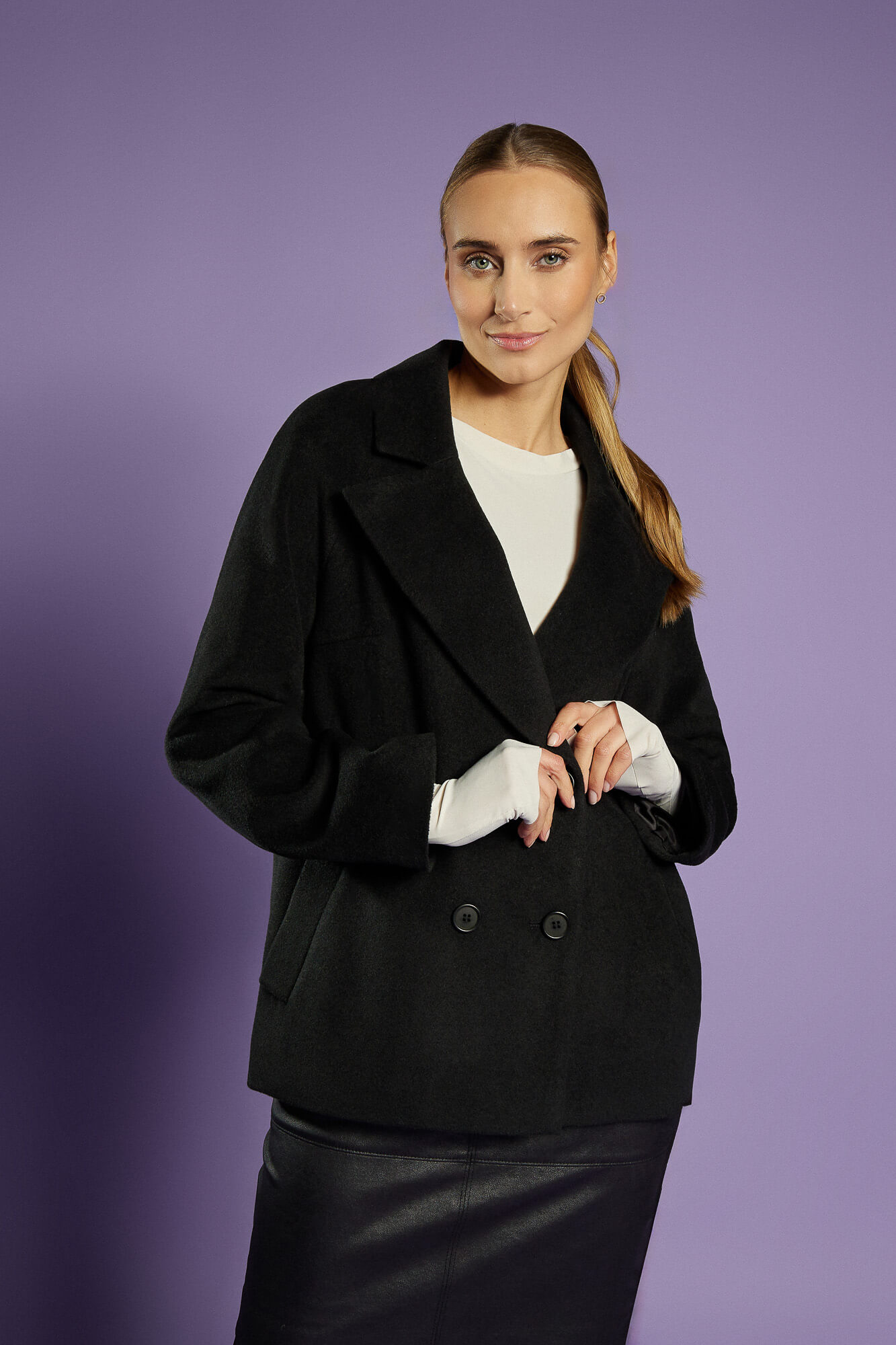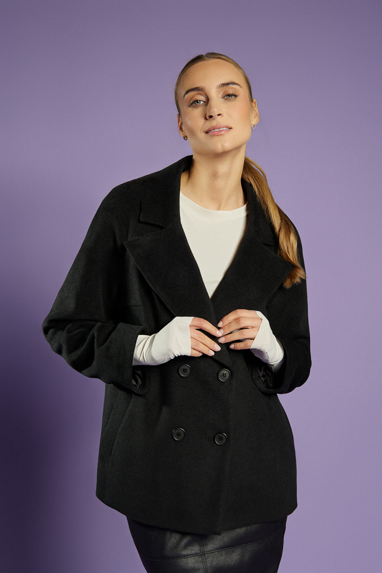 Czarna dwurzędowa kurtka o pudełkowym kroju to ponadczasowy element garderoby, łączący elegancję z funkcjonalnością. Charakteryzuje się dużym kołnierzem oraz stylowymi klapami, które dodają całości wyjątkowego charakteru i sprawiają, że kurtka prezentuje się niezwykle szykownie.Długi rękaw zapewnia komfort termiczny i ochronę przed chłodem, co czyni kurtkę idealnym wyborem na chłodniejsze dni. Praktyczne kieszenie to doskonałe rozwiązanie dla kobiet, które cenią wygodę i potrzebują miejsca na drobiazgi lub możliwość ogrzania dłoni. Uniwersalna czerń sprawia, że kurtka świetnie komponuje się z różnymi stylizacjami – zarówno z eleganckimi, jak i casualowymi outfitami. To doskonały wybór dla każdej kobiety, która szuka klasycznego, a zarazem stylowego elementu swojej garderoby.