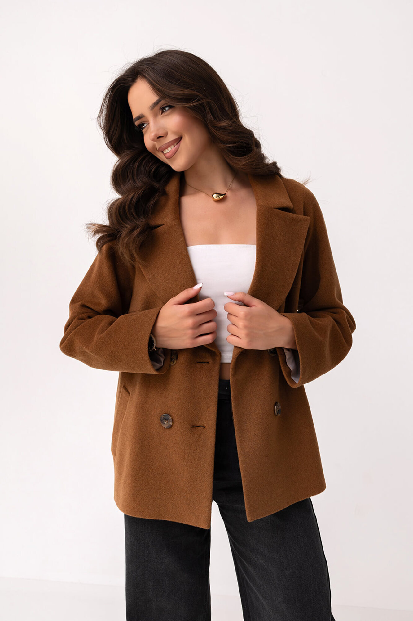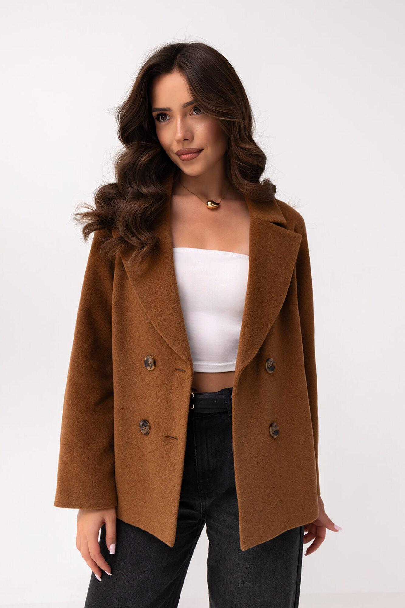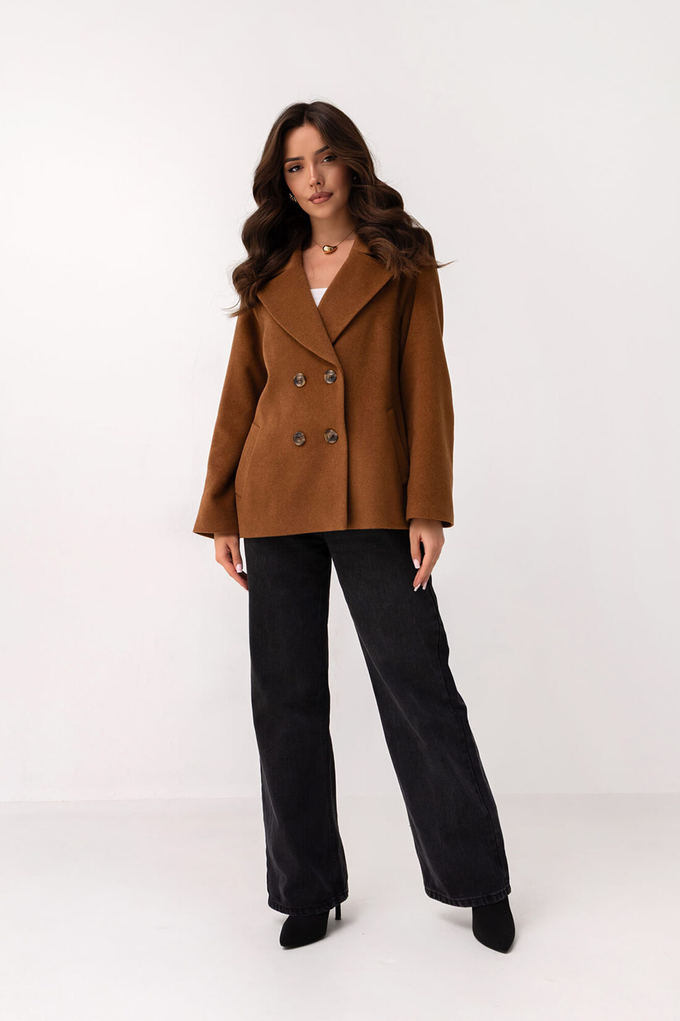 Kurtka wykonana z wysokiej jakości materiału w kolorze karmelowym z dodatkiem wełny, który zapewnia trwałość, ciepło i przyjemną w dotyku fakturę. Klasyczny, dwurzędowy fason z szerokimi klapami został uzupełniony o eleganckie guziki w kontrastowym odcieniu, co podkreśla ponadczasowy charakter modelu. Proste linie i minimalistyczny krój sprawiają, że kurtka prezentuje się schludnie i elegancko, a praktyczne kieszenie boczne dodają funkcjonalności. Model sięga do bioder, co nadaje mu uniwersalny charakter i pozwala na łatwe łączenie z różnymi stylizacjami oraz nie krępuje ruchów.