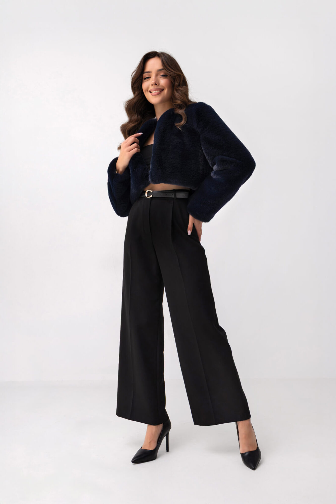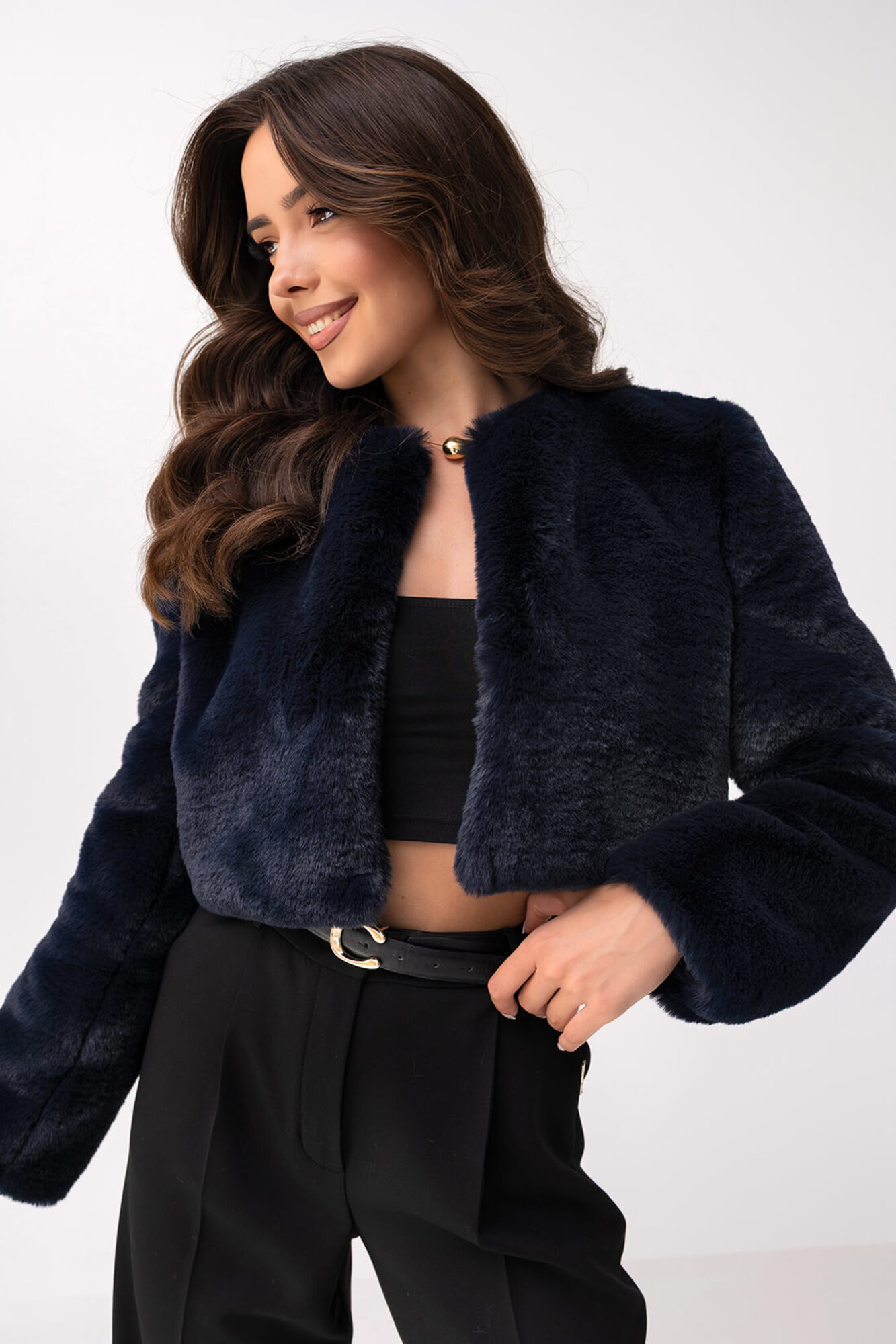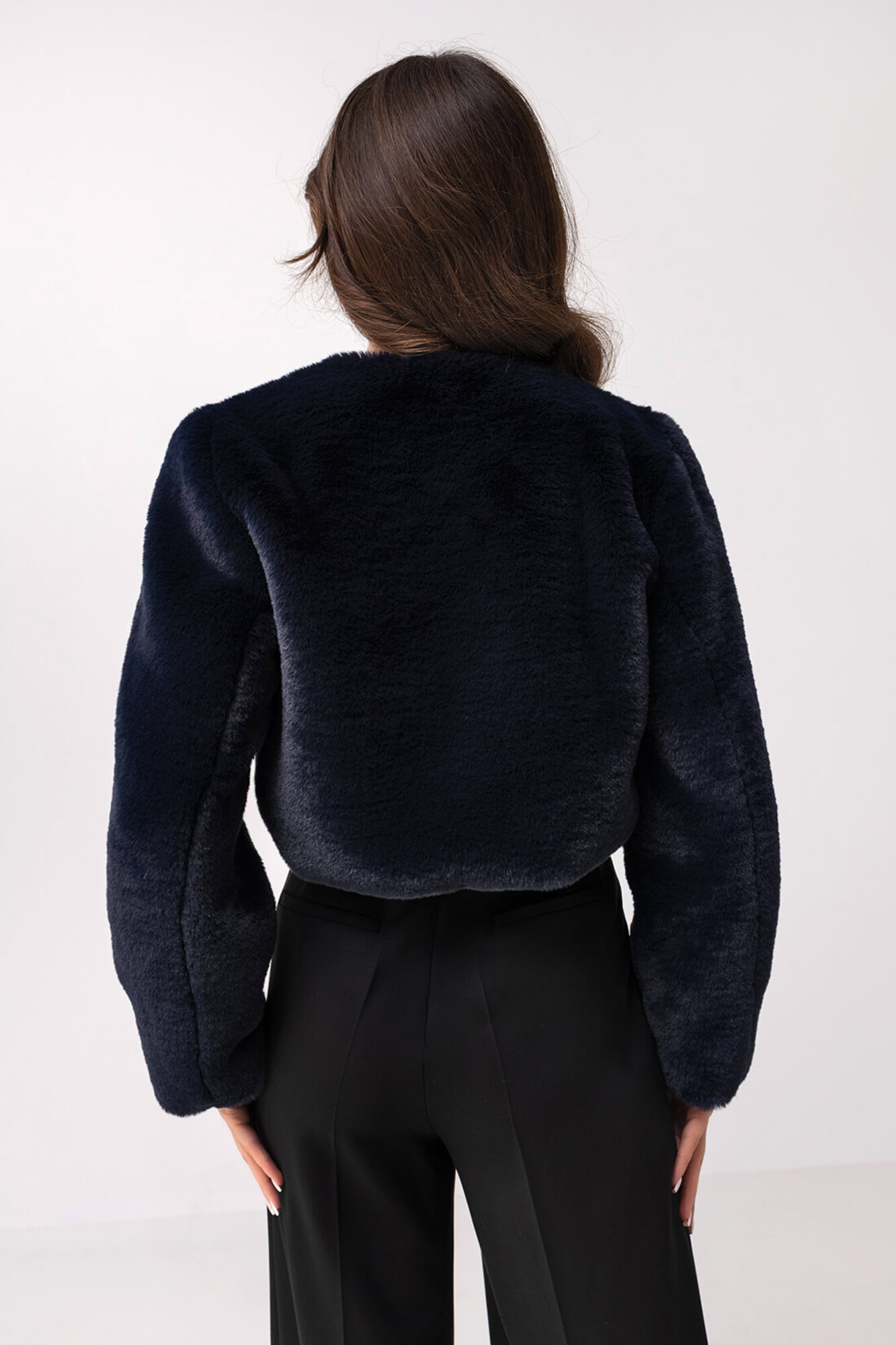Granatowe futerko damskie w krótkiej formie, wykonane ze sztucznego futra o gęstym, miękkim włosiu, które nadaje całości eleganckiego charakteru. Zapinane na dyskretne haftki, zachowuje czystą linię i estetyczny wygląd bez zbędnych dodatków. Głęboki odcień ciemnego granatu sprawia, że futerko prezentuje się niezwykle szykownie i klasycznie. Prosty krój bez kołnierza podkreśla nowoczesny charakter projektu, a precyzyjne wykończenie świadczy o wysokiej jakości wykonania. To stylowe i funkcjonalne okrycie, które wyróżnia się dopracowaniem detali.