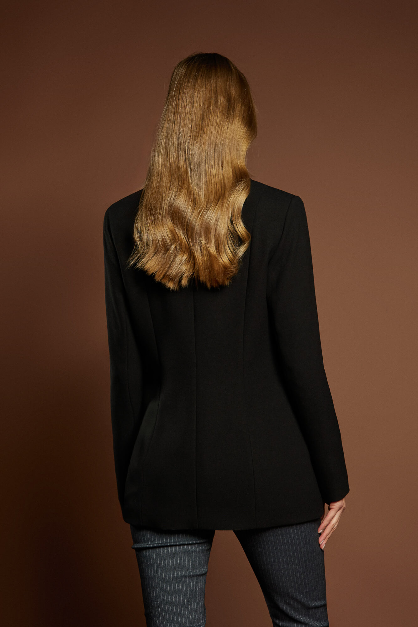 Długi czarny żakiet to elegancki element garderoby, który doskonale sprawdza się w różnych okazjach. Można go nosić zarówno na co dzień, jak i na bardziej formalne wyjścia. Dzięki uniwersalnemu kolorowi, łatwo zestawić go z innymi ubraniami, tworząc stylowe i klasyczne outfity. Dodatkowo, długi krój żakietu dodaje szyki. Warto go mieć w swojej szafie, ponieważ nigdy nie wychodzi z mody.