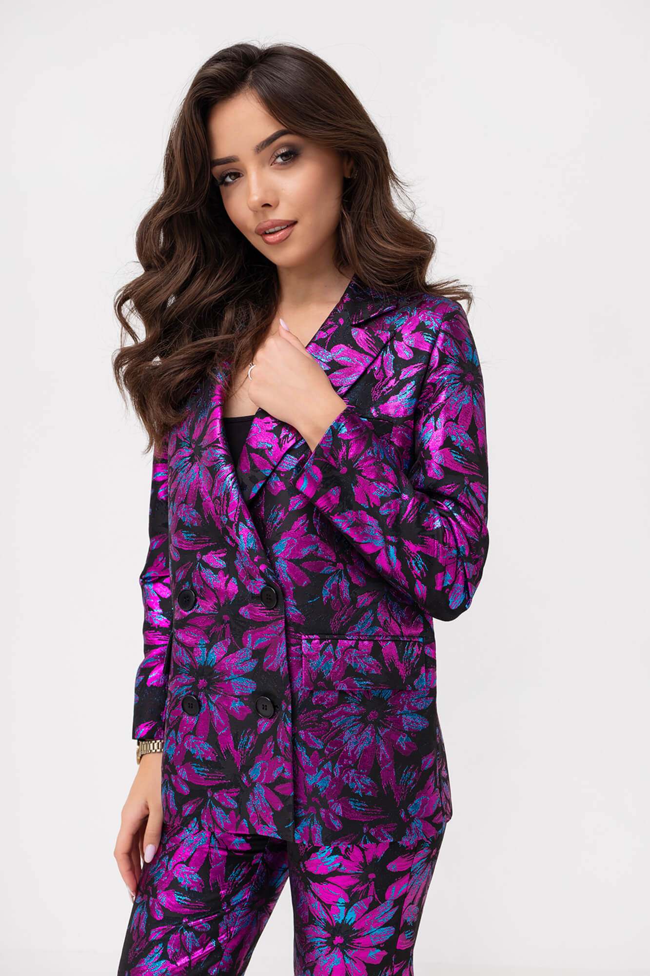 Stylowe spodnie w intensywnym, kwiatowym princie w odcieniach fioletu, to propozycja dla kobiet, które lubią bawić się modą i wyróżniać się z tłumu. Wykonane z wysokiej jakości materiału, pięknie układają się na sylwetce, podkreślając kobiece kształty jednocześnie zapewniając komfort noszenia. To model, który w połączeniu z klasycznym topem i szpilkami stworzy efektowną stylizację, ale równie dobrze wygląda w zestawie z dedykowaną marynarką w tym samym wzorze, dostępną osobno. Dzięki temu możesz zbudować pełen garnitur o spektakularnym charakterze lub postawić na bardziej casualowy look, łącząc spodnie z gładką górą.