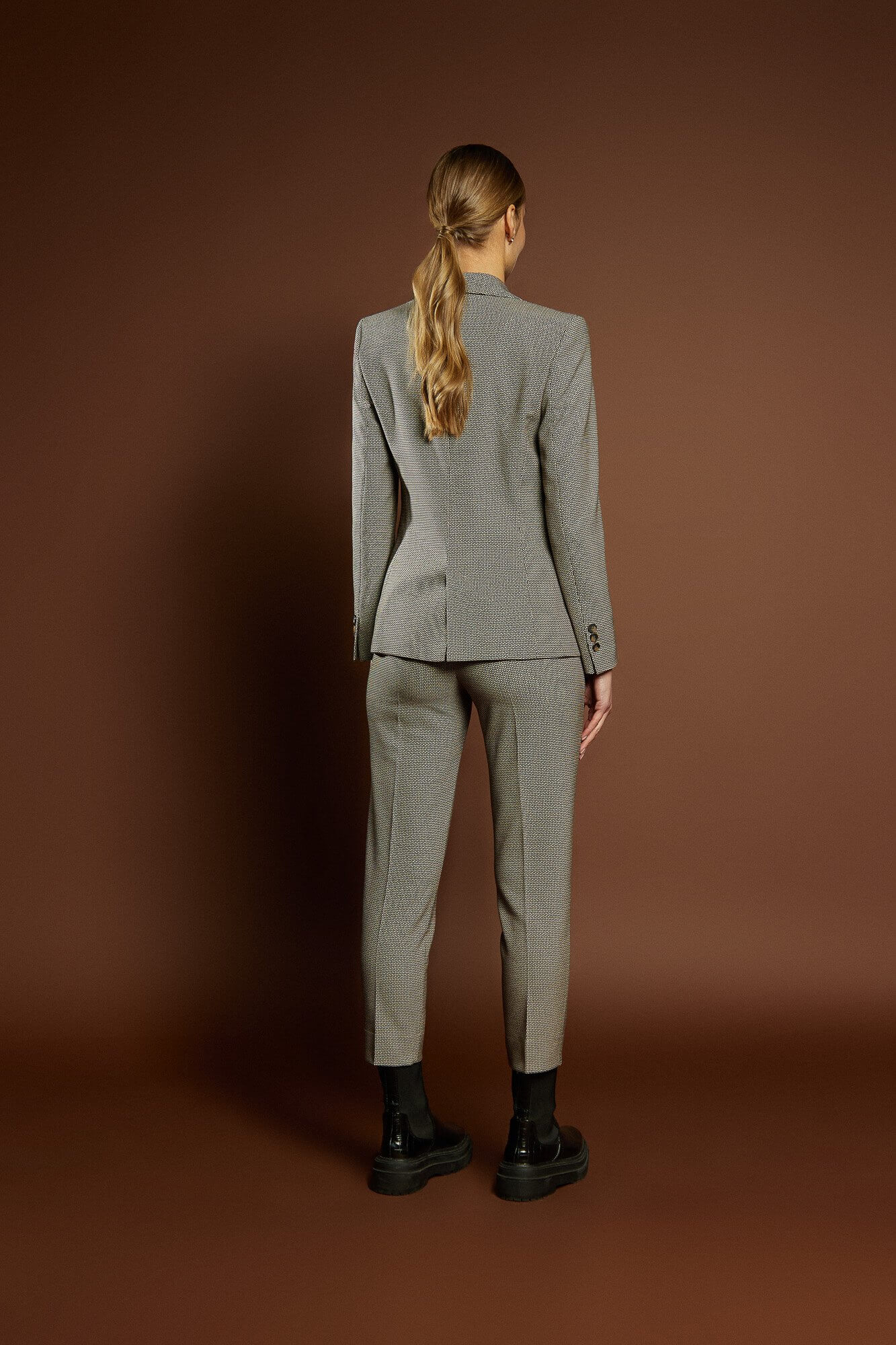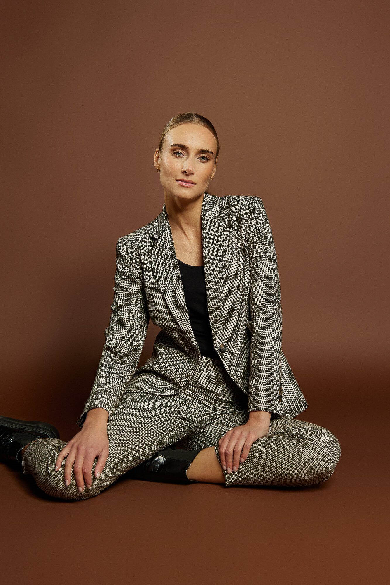 Żakiet można zestawić z dostępnymi do kompletu spodniami, tworząc spójną i stylową całość, idealną jako nowoczesny garnitur damski.