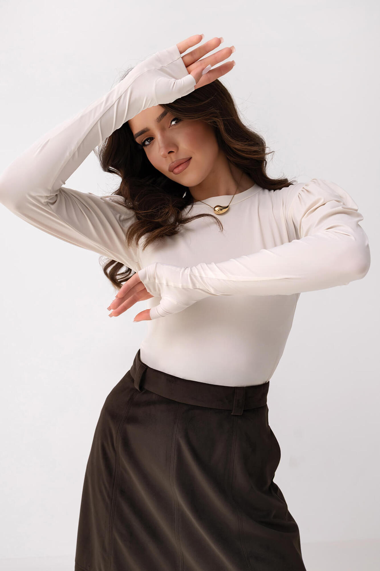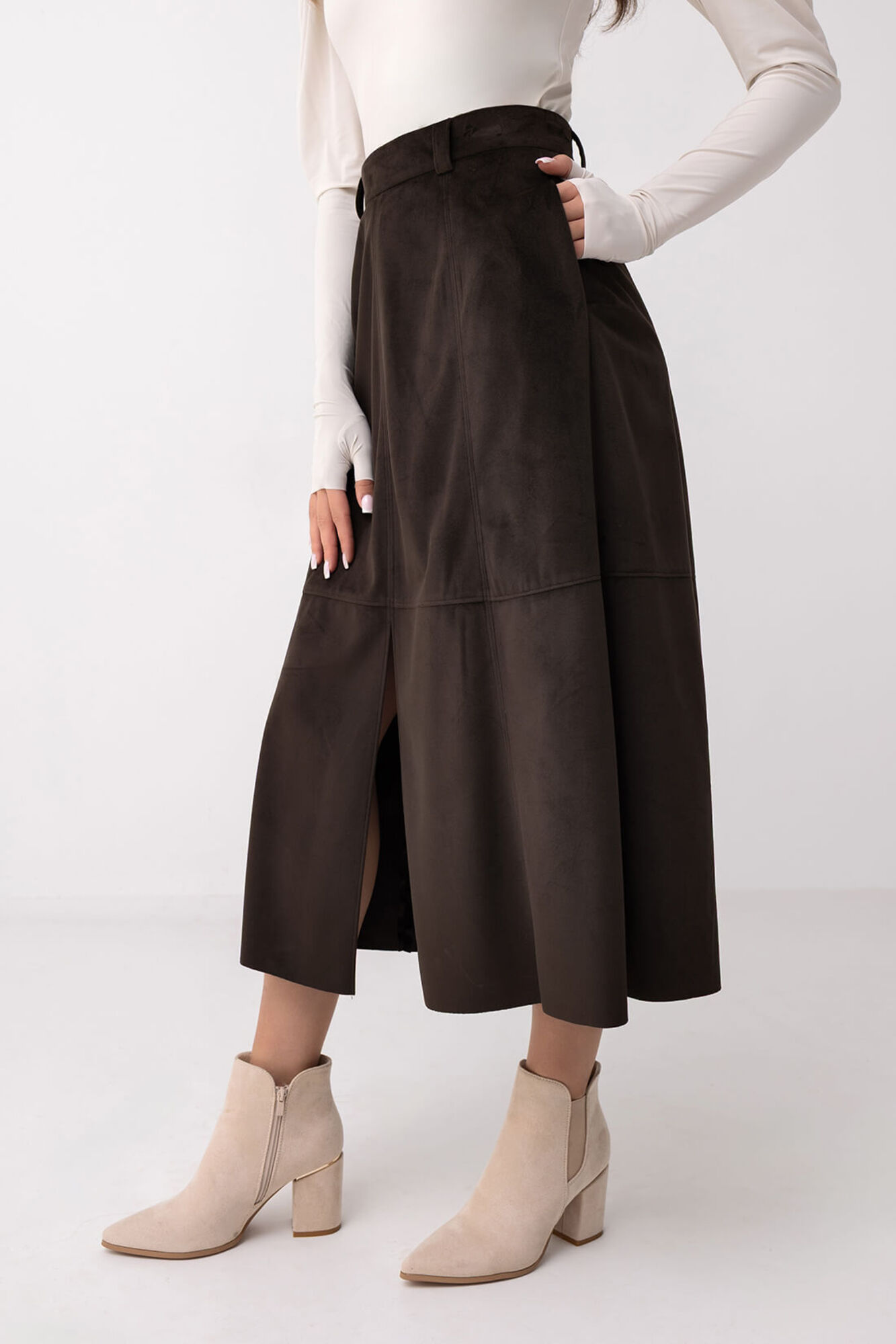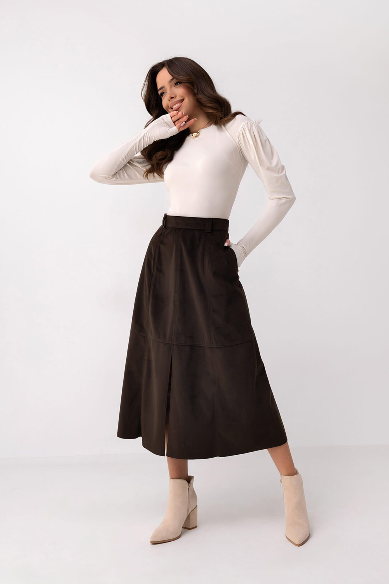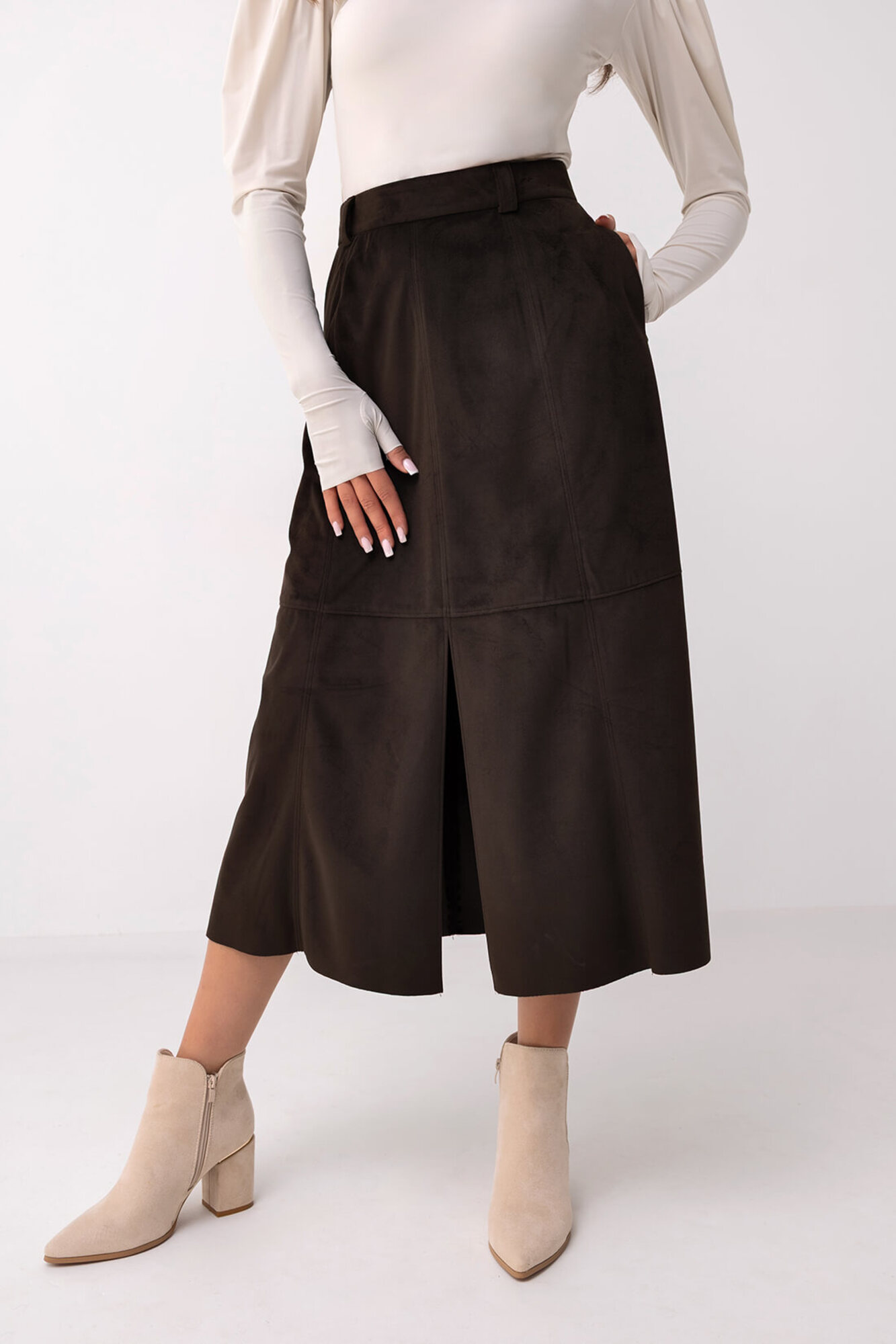 Spódnica midi uszyta z miękkiego zamszu syntetycznego w odcieniu głębokiego, czekoladowego brązu. Materiał o subtelnie matowej fakturze nadaje jej elegancki i wyrafinowany charakter. Model wyróżnia się prostą, lekko rozkloszowaną linią, która łączy wygodę z klasyczną formą. Centralne rozcięcie z przodu dodaje konstrukcji lekkości i podkreśla nowoczesny styl spódnicy. Starannie zaprojektowane przeszycia nadają całości wyrazistości i eleganckiego wykończenia. To spódnica, w której główną rolę odgrywa szlachetny wygląd zamszowego materiału i dopracowany fason, tworzące spójny i ponadczasowy projekt.